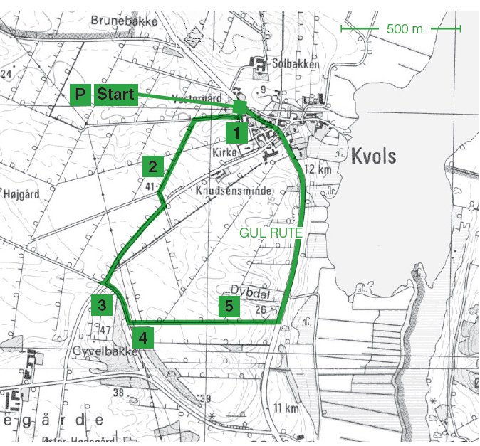 Den afmærkede rute er ca. 4 km og udgår fra forsamlingshuset, hvor der kan parkeres. Du kan også starte fra rastepladsen ved Virksundvej. Ruten er markeret med jydepottesymbol og gule pile på pæle. Langs sporet er der i 2003 plantet grupper af frugttræer, fortrinsvis gamle danske sorter.